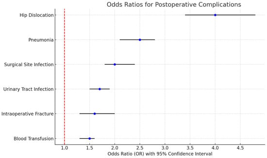 RRs were presented as they better represent the relative likelihood of complications within the dataset’s limitation of capturing only in-hospital outcomes. Raw incidence rates may underestimate events that occur post-discharge (e.g., dislocation), so RRs are more reflective of relative risk in this context.