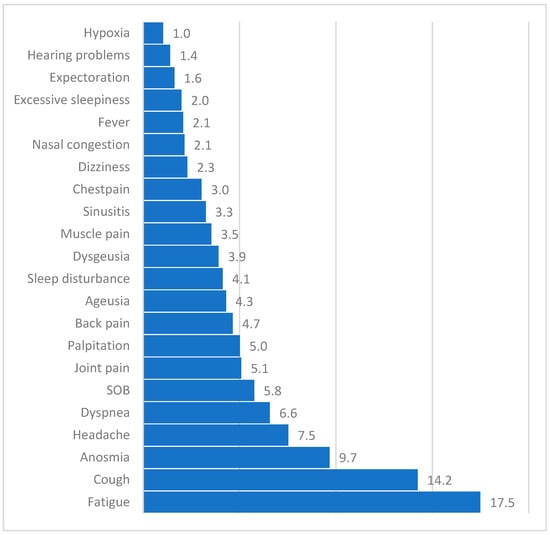 In total, 63.8% of participants reported at least one LC symptom. The most common symptoms included fatigue (17.5%), cough (14.2%), anosmia (9.7%), headache (7.5%), and dyspnea (6.6%). Other less frequent symptoms included shortness of breath, joint pain, palpitations, back pain, and sleep disturbances. Additional symptoms are summarized in Figure 1.