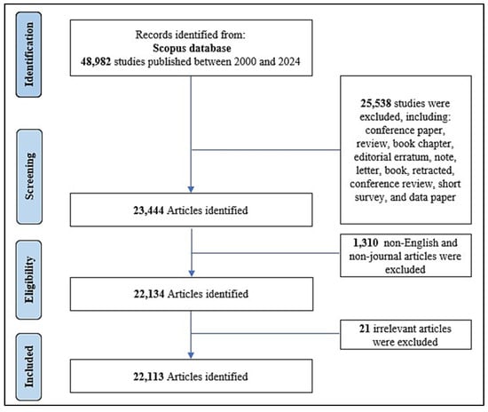 This study employed a query in the search fields of the article title (Supplementary Material, Table S1). On 1 January 2025, a search strategy was carried out, created based on the search strategies of several previous bibliometric articles [18,22]. A question mark was used in the search strategy to capture a wide range of related keywords, and quotation marks were applied to retrieve exact phrases as specified in the search query. The final search strategy was employed after several preliminary attempts and validation processes. It included two main aspects: (AI and ML) and (health and medicine). Stringent inclusion and exclusion criteria were implemented to ensure both relevance and analytical focus. Inclusions involved articles published within the period from 1 January 2000 to 31 December 2024, to focus on contemporary research, articles written in English, and peer-reviewed original research articles. The exclusion criteria were duplicate articles, articles written in non-English languages, non-journal literature such as conferences, book series, trade journals, and undefined, and articles unrelated to AI/ML in health and medicine.