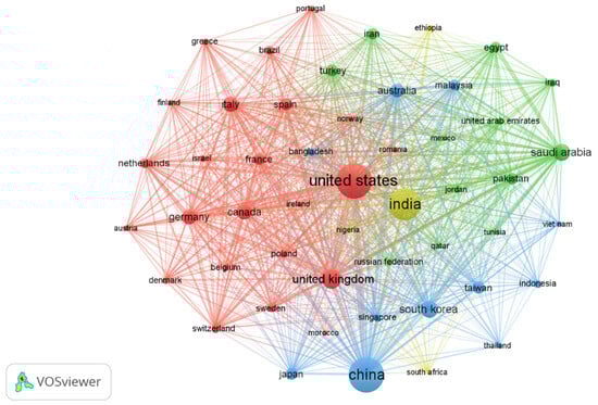The network visualization map of countries, which considers countries with a minimum contribution of 88 articles, provides valuable insights into the dynamics of global research collaboration within a specific field (Figure 3). Within this map, a total of 50 countries are represented in this network, and noteworthy observations emerge. Primarily, the United States plays a significant role, exhibiting the highest number of connections and occupying a prominent position in the network. This highlights its significant research contributions and extensive collaborative efforts in the domain. The significant role of the United States in global research collaboration is evident from its extensive network connections (Links = 49, TLS = 3342), positioning it as a key facilitator of international scientific cooperation. A particularly noteworthy finding is the strong research partnership between the United States and India, as indicated by the substantial link strength between these nations (Links = 49, TLS = 1841). This reflects a high degree of scholarly engagement and exchange, reinforcing the global nature of scientific research. Additionally, the United Kingdom (Links = 49, TLS = 2125) and India (Links = 49, TLS = 1730) emerge as significant collaborators with the United States, further highlighting the importance of cross-border scientific cooperation in advancing research within this field. Interestingly, Saudi Arabia (Links = 49, TLS = 1706) stands out on the map with a large node size. This suggests that Saudi Arabia has made substantial contributions to research within the field and has its network of collaborations with various countries. Notably, the map highlights a particularly strong research partnership between Saudi Arabia and India. This collaboration underscores the active exchange of knowledge sharing and expertise between researchers and institutions in these two countries, further enriching the global research landscape in this domain. Cooperation between countries/regions has promoted the development of research.
