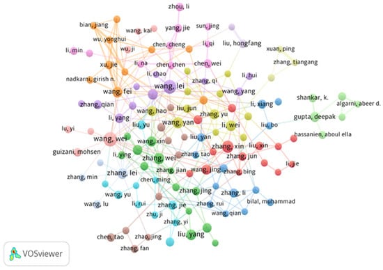In terms of total citations (TC) and impact indices, which consider career length, Zhang Y emerges as the most influential author (TC = 9839; h-index = 38; g-index = 95), followed by Wang J (TC = 7994; h-index = 33; g-index = 86) and Liu Y (TC = 7853; h-index = 39; g-index = 84). To further refine the bibliometric assessment, a network visualization analysis was conducted (Figure 4). In the co-authorship network, authors are represented as nodes, where connections signify co-authored publications, and the thickness of the lines reflects the strength of collaboration. The analysis focuses on authors with a minimum of ten publications, without a citation threshold. Overall, the network map identifies 125 authors organized into 14 clusters, providing insights into collaborative structures within the field.