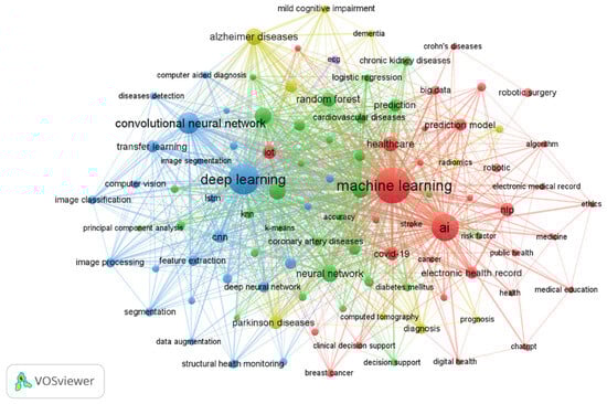 In the upper-left quadrant, labeled as ‘Niche Themes’, we find highly developed themes that remain isolated. These themes have strong internal connections but do not connect well with others, which limits their broader significance. The themes elucidated in this quadrant are related to several topics, the most frequent being “Crohn’s disease”, “cancer”, “stroke”, “personalized medicine”, “inflammatory bowel diseases”, and “CNN”. The lower-left quadrant, called ‘Emerging or Declining Themes’, highlights themes with both low density and centrality, suggesting they are not well-developed or may be losing relevance. This quadrant includes themes like “robotic” and “robotic surgery”. The upper-right quadrant, referred to as ‘Motor Themes,’ is where we see themes with both high density and centrality. These themes are well-developed, highly relevant, and connected to others. Key themes in this quadrant include topics like the “electronic health record”, “mental health”, “precision medicine”, “COVID-19”, and “IoT”. Finally, the lower-right quadrant, known as ‘Basic Themes,’ represents foundational and transversal themes. These are important for further study but have not been fully developed yet. The themes displayed in this quadrant are “deep learning”, “classification”, “Alzheimer’s disease”, “Parkinson’s disease”, “MRI”, “SVM”, “neural networks”, “Random Forest”, and “feature selection”.