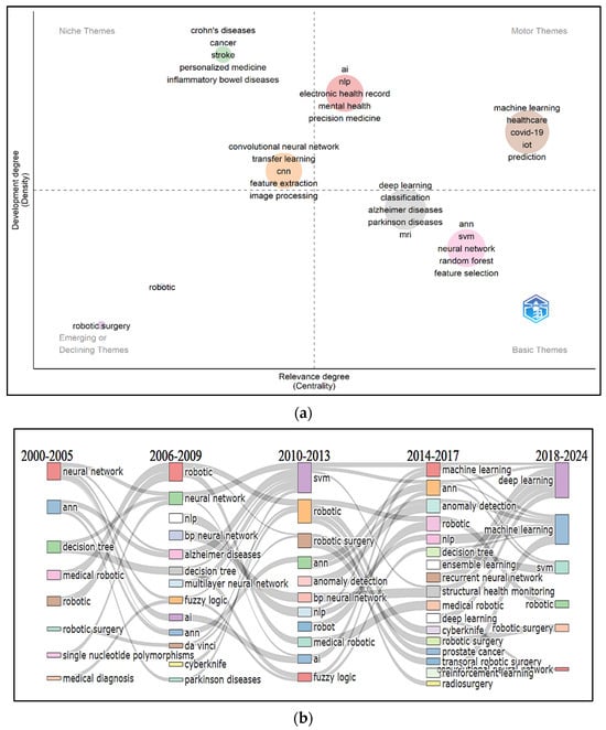 The primary goal of the thematic map examination was to intuitively analyze the development of themes in AI and ML-related research in health and medicine between 2000 and 2024. To do this, we built a two-dimensional matrix using the conceptual network and divided it into four distinct quadrants based on the centrality and density of themes (Figure 6a).