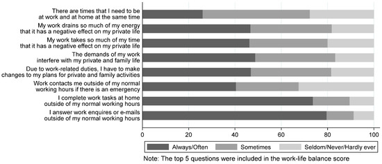Figure 1 shows the impact of work on personal lives. The majority, at least often, reported completing work-related tasks during non-working hours (>74%), and being contacted outside working hours in emergencies (40%). Almost half reported that always/often work negatively impacted their private life (46%), that they changed plans due to work-related duties (47%), and that work demands interfered with their private life (48%). A quarter often juggled being at work and at home simultaneously (26%). Work–life imbalance score averaged 2.7 (SD = 0.8).