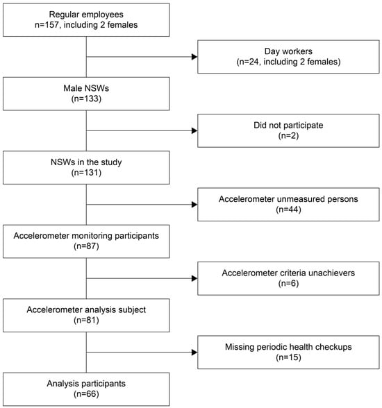 This cross-sectional study involved NSWs employed in the Japanese manufacturing industry between September and December 2018. The three manufacturing mills where the participants worked were located in urban areas (business districts separate from residential areas) within the same region (Kansai). The work activities and patterns were uniform across all mills under one company. The potential participants comprised 133 NSWs (all of whom were men), excluding 24 day workers (including two females) from the 157 regular employees of these three manufacturing mills. We excluded two individuals who did not give informed consent, 44 individuals who received an accelerometer but did not wear it, and 15 who did not undergo periodic health examinations at the workplace. Additionally, six workers who wore the accelerometer for less than 3 days were excluded, consistent with previous studies that utilized a similar exclusion criterion [19]. The final analysis included 66 male participants (Figure 1).
