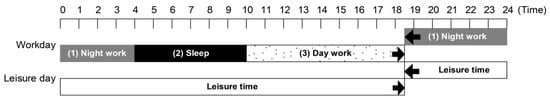 The workday was defined as 24 h spent at the company, from arrival to leaving work, consisting of three components: (1) night work, from 18:30 to 04:00 the next day; (2) day work, from 10:00 to 18:30; and (3) free time between (1) and (2), from 04:00 to 10:00 (during which participants could bathe in the company bathroom and sleep in a capsule-type bed). Leisure days were defined as 24 h spent outside the company, from leaving the office until arriving at work the next day (Figure 2).