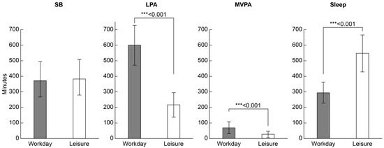 Comparison of daily activity time (minutes/day) for each workday and leisure day. Values are presented as means (standard deviations). Wilcoxon signed-rank test, *** p < 0.001. LPA, low-intensity physical activity; MVPA, moderate-to-vigorous physical activity; SB, sedentary behavior.