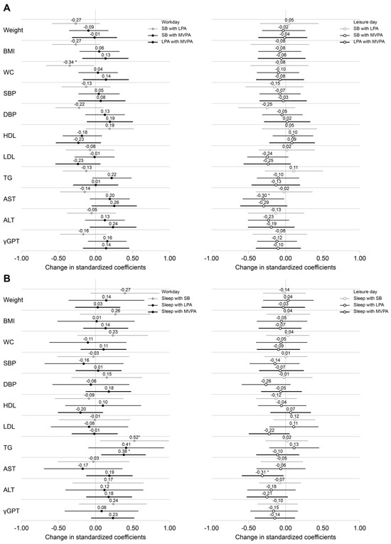 On workdays, reallocating 30 min of SB to LPA was significantly associated with a decrease in waist circumference (β = −0.344, 95% confidence interval [CI]: −0.668 to −0.019), but was not significantly associated with weight or BMI. In addition, reallocating sleep to SB or MVPA was significantly associated with higher TG levels (sleep to SB, β = 0.524, 95% CI: 0.062–0.986; sleep to MVPA, β = 0.379, 95% CI: 0.087–0.671). On leisure days, reallocating SB or sleep to MVPA was significantly associated with lower AST levels (SB to MVPA, β = −0.298, 95% CI: −0.574 to −0.022; sleep to MVPA, β = −0.308, 95% CI: −0.583 to −0.032).
