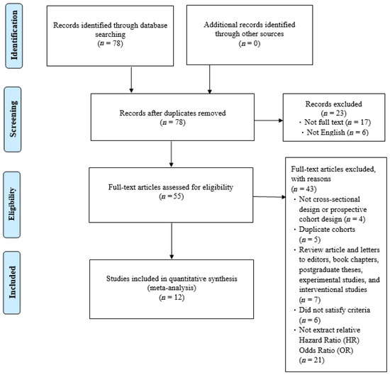 Odds ratios or hazard ratios were extracted from the included studies. If a study provided several odds ratios or hazard ratios (using different covariates), the odds ratios and hazard ratios that were the most adjusted were extracted. A random-effects model was employed to combine the odds ratios or hazard ratios and to account for variations in the true effect size across studies. The heterogeneity of effect sizes was assessed using the I2 statistic. All meta-analyses were conducted using Review Manager (RevMan) version 5.4 (The Cochrane Collaboration).