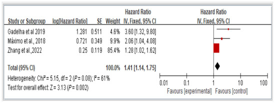 The results reveal the overall fall risk across all three studies assessing this variable. The findings indicate that individuals with dynapenic abdominal obesity had a higher risk of falls than did those without dynapenic abdominal obesity (hazard ratio = 1.41, 95% CI = 1.14–1.75, p < 0.05; Figure 4).