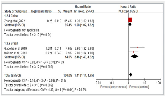 We conducted a subgroup analysis of fall risk in the included studies on the basis of the country of publication. Figure 4 illustrates the fall risk among older adults with dynapenic abdominal obesity in China and Brazil stratified by hazard ratio. Among the included studies, one was conducted in China, and two were conducted in Brazil. The risk ratio between these two study groups was calculated and analyzed using a random-effects model. The results indicate a significant difference in fall risk among individuals with dynapenic abdominal obesity recruited from different countries. Specifically, older individuals with dynapenic abdominal obesity in China had a higher risk of falls than did those in Brazil (hazard ratio = 1.41, 95% CI = 1.14–1.75, p < 0.05; Figure 6).