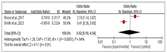 We analyzed the overall risk of disability associated with dynapenic abdominal obesity, stratified by OR across two studies. The findings indicate that the risk of disability is not significantly associated with dynapenic abdominal obesity (odds ratio = 0.92, 95% CI = 0.18–4.54, p > 0.05; Figure 7).