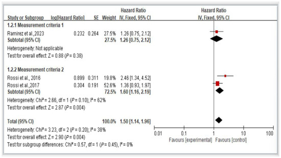 Subgroup analysis of different measurement criteria for falls, stratified by hazard ratio [11,13,16]. This figure presents the results from the meta-analysis conducted in the present systematic review. The red squares represent the odds ratio estimates of individual studies, with size indicating study weight. The black diamond shows the overall pooled effect, where its center is the combined odds ratio and the width represents the 95% confidence interval.