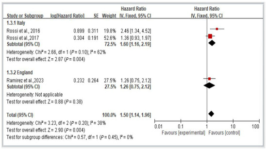 Subgroup analysis of mortality risk in Italy and England, stratified by hazard ratio [3,17,18]. This figure presents the results of the meta-analysis conducted in the present systematic review. The red squares represent the odds ratio estimates of individual studies, with size indicating study weight. The black diamond shows the overall pooled effect, where its center is the combined odds ratio and the width represents the 95% confidence interval.