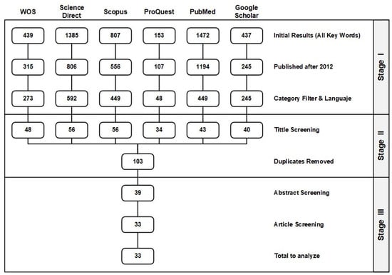 The filtering process described in Table 2 resulted in the articles represented in Figure 1 for each search engine. As explained above, in Stage I, only the final articles were considered, suppressing all preprints or editorials, reducing the number of articles from 4693 to 2056. After that, the methodology explained was conducted to reduce the number of articles to 39 articles after Stage II. In the selected literature, in Stage III, the abstract and the article content were revised to obtain the final 33 articles to be analyzed in the review and to extract the information needed to analyze the current state of the art and for the analysis of the research questions.