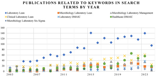 The specific topic keywords are Microbiology Laboratory Lean, with 347 articles, Microbiology Laboratory Management with 675, and 88 articles on Microbiology Laboratory Six Sigma. The specificity of the keywords implies a reduction in the overall results; however, the final number of articles to analyze manually was closer to the initial number because the results were more precise, and the filters did not reduce the final number of articles. In any case, the trend over the years is increasing, clearly visible with the core term laboratory Lean.