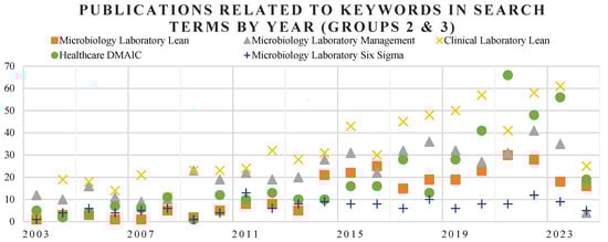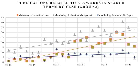To enhance data presentation and interpretation, individual graphs with a reduced scale have been generated, as shown in Figure 3. This graph focuses on specific aspects of the dataset to provide clearer insights and highlight key patterns. Figure 3 presents results based solely on the keywords from Groups 2 and 3. An increasing number of publications related to the application of Lean in clinical laboratories is observed from 2012 onward, whereas papers concerning Healthcare DMAIC began to rise approximately five years later. Focusing on the context of microbiology laboratories, as depicted in Figure 4, the highest number of publications is related to general laboratory management. Lean practices applied specifically to microbiology labs rank second, followed by the deployment of DMAIC methodology, which ranks third.
