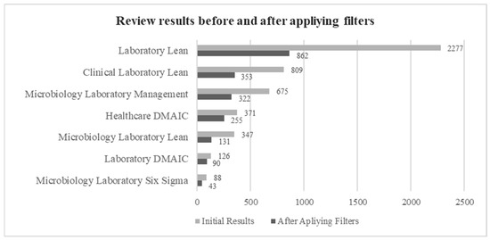 After implementing the language filter and publication date after 2012, the number of papers was reduced from 4693 to 3223, cutting the results by approximately 30%. The last filter in Stage I is the subject or area filter of the search engine, which further reduces the number of articles to 2056. In Figure 5, the initial results are compared with those obtained after applying filters. The reduction in results for generic terms like “Laboratory Lean” is very high compared with the most specific, like “Microbiology Laboratory Sigma”, due to the specificity of the terms. In this case, the filtering has been performed manually by reading the title and abstract. In all cases, the keywords are chosen to ensure that the search engines retrieve all articles related to the application of LSS in the microbiology laboratory.