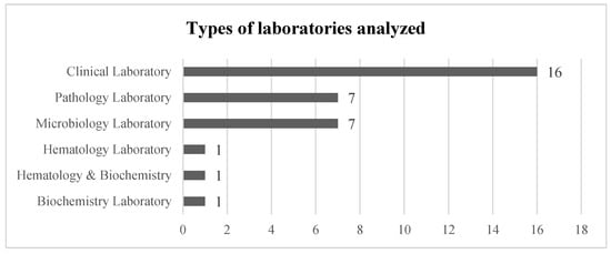 The review process focuses on LSS techniques applied to microbiology laboratories. According to the inclusion criteria, several factors have been analyzed, such as the type of laboratories where LSS projects are deployed in the healthcare sector, the main LSS tools used in these projects, and KPIs selected for progress monitoring. The type of laboratories analyzed in the papers was the first inclusion criterion considered. The scope of this review is the microbiology laboratory, although the analysis carried out in this type of lab is not always performed in a specific laboratory; some hospitals, mainly small ones, perform all work in clinical laboratories. In addition to clinical and microbiology laboratories, Figure 6 shows publications referring to LSS projects applied to other related laboratories in healthcare facilities.