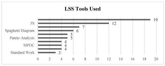 Secondly, we centered our research on the LSS tools cited in the papers selected in Stage III. Analyzing whether the tools commonly used in the manufacturing sector are also applied to LSS projects in healthcare, and specifically in laboratories, offers valuable insights. In Figure 7, the number of articles including the application of the top 10 LSS tools are listed. The most common tool identified in the research is Value Stream Mapping (VSM), used in 19 articles, followed by 5S in 12 publications. The third position is held by the DMAIC methodology, used in 7 articles, compared to the second tool, used in 12. Other LSS tools that are used less frequently include Spaghetti Diagrams, waste reduction analysis, Pareto analysis, CTQs, SIPOC, fishbone diagrams, and standard work.