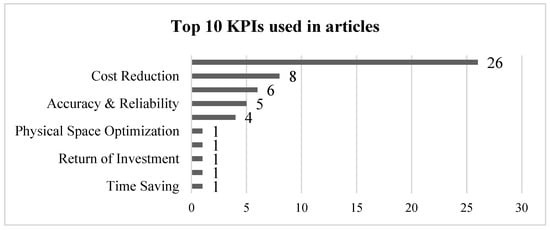 In Stage III of the review, the next concept examined was the definition and application of KPIs in LSS projects within clinical and microbiological laboratories. To analyze the results of an LSS project, the objectives must be first defined by measurable KPIs that will be followed before and after the LSS project to analyze the real process improvement. In Figure 8, the top 10 KPIs identified in the final screened articles are shown. The most used KPI is turnaround time, mentioned in 26 of the 33 final articles selected [26,30,57]. The second most frequent KPI is cost reduction, cited in 8 articles [47,52,54]