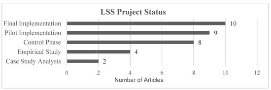 Most articles described LSS projects applied in a real laboratory environment totaling 27, while others were theoretical or without implementation. Projects that led to permanent changes to workflow are classified in the articles as being in the final implementation and control phase, with 18 out of the 33 articles in this category. In contrast, 9 of the 33 articles that focus on pilot projects provide no information on final implementation or whether the project led to permanent process changes. This classification is important for identifying unforeseen events during or after the optimization process and the mid/long-term effects in a real environment after project implementation.