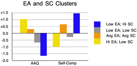 Final cluster centers, arithmetic means for standardized values of AAQ (EA), and self-compassion (SC) in the extracted clusters.
