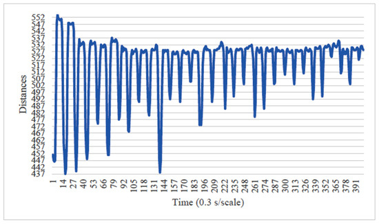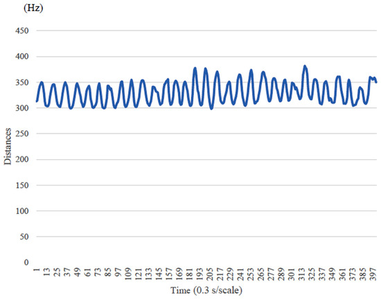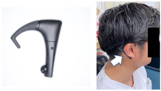 The occlusal pressure test was performed using the Dental Pressure Scale II® (GC, Tokyo, Japan,) (Figure 1), which subjects were asked to insert into their mouth and bite down on for 3 s. After clenching, occlusal pressure was measured using a dedicated measuring instrument. The participants practiced clenching using a protective sheet in advance. The reference value was set to 500 N, based on the criteria for oral dysfunction [24]. Mastication motion was measured using bitescan® (BH-BS1RR, SHARP, Tokyo, Japan). Bitescan® is a device with an infrared distance sensor and an accelerometer, and it has been shown to be effective in measuring the number of chews [25]. Bitescan® can measure changes in the skin surface behind the ear and provide information on chewing frequency, chewing tempo, the number of chews per mouthful, and head position (Figure 2). The device is designed to be worn on the right ear and includes an adjustable ear hook. The appropriate ear hook for each participant was selected based on the size of their ear. Prior to measurement, the subjects wore bitescan® and connected it to a tablet device (Sharp SH-T01) via Bluetooth. We then confirmed that data could be properly collected using a dedicated application. For data collection with bitescan®, gummy jelly was used as the test food in accordance with the mastication function testing methods. Prior to the test, the participants practiced chewing the gummy jelly on both sides to ensure that the calibration feature of bitescan® could sample data correctly. Changes in skin shape during chewing over the 20 s test period were plotted by bitescan® as waveforms, with time (0.3 s/scale) on the horizontal axis and distances (Hz) on the vertical axis (Figure 3).