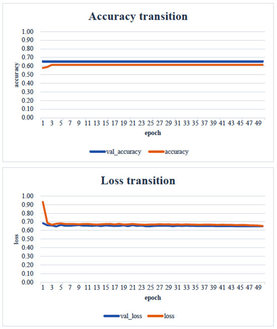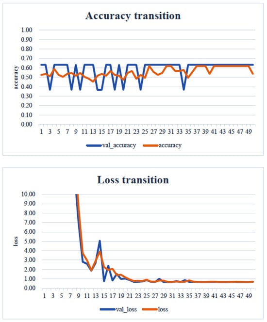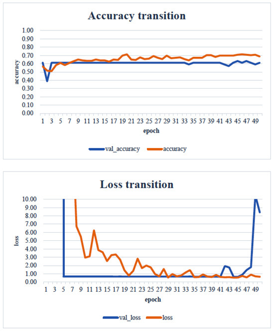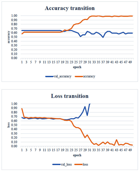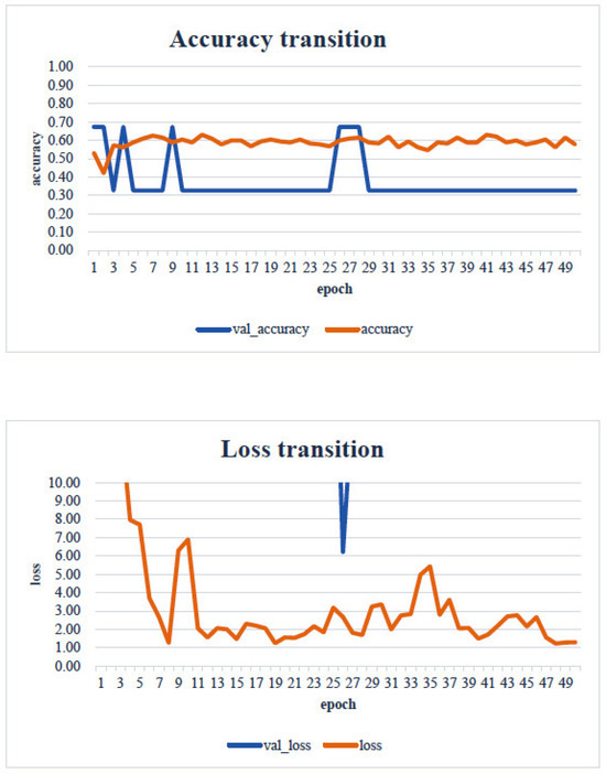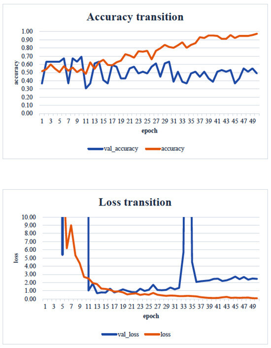 As shown in Figure 7, as the number of learning epochs increased, the accuracy improved, and the loss decreased. However, although the validation accuracy improved, the validation loss showed the opposite trend, suggesting that overfitting occurred in the CNN analysis on this dataset.