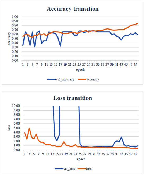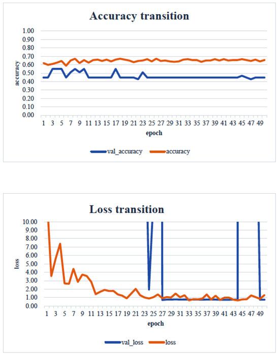 When the minimum and maximum values on the vertical axis of the obtained image data were used, the accuracy of the learning curve improved from the 20th learning epoch (Figure 7). However, when the minimum and maximum values on the vertical axis were unified to the range of 0 to 700, almost no change was observed in the learning curve, even with an increase in the number of learning epochs (Figure 8).