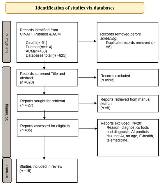 The search keywords and their combinations were performed closely with a librarian. According to the PEO model, the database of thesauruses and Medical Subject Headings (MeSH) terms that generated synonyms were used to identify relevant search terms for the preliminary search. Electronic searches were conducted across Pub-Med, CINAHL Complete (EBSCO), and the ACM Digital Library until September 2024. The inclusion criteria in the articles were patients over 18 years old and those with type 1 or 2 diabetes. The inclusion criteria for selecting articles and their research method were qualitative and quantitative original peer-reviewed articles. Exclusion criteria were children, pregnant women, and other types of diabetes, such as prediabetes and diabetes insipidus. Exclusion criteria for the scientific articles were being older than ten years and not written in English. The study included empirical studies that could be credible sources. The inclusion and exclusion criteria of articles increase the study’s reproducibility [34]. In an integrative review, the primary sources should be of high quality by adhering to inclusion and exclusion criteria to specify their area in the study [33]. Manual searching can be used when data search does not provide sufficient articles [34]. The search terms reported were artificial intelligence, diabetes mellitus, digital health technology, district nurse, and patient-centered care. The search terms, Prisma flow diagram, and article matrix summarize the search process (Figure 1, Table 1, Appendix A).