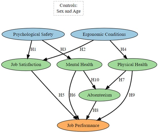 The theoretical model for this study, which examines the factors influencing job performance among hospital employees, is illustrated in Figure 1. The orange variable, job performance, serves as the dependent variable, whereas the green variables—job satisfaction, mental health, physical health, and absenteeism—are endogenous variables influenced by other factors in the model. The blue variables, psychological safety and ergonomic conditions, are exogenous variables directly affecting the endogenous variables but are not influenced by others in the model. The model outlines the hypothesized relationships (H1–H10) between these variables, with sex and age included as control variables to account for demographic effects. We believe that this framework offers a structured approach to understanding the dynamics influencing job performance in healthcare settings.