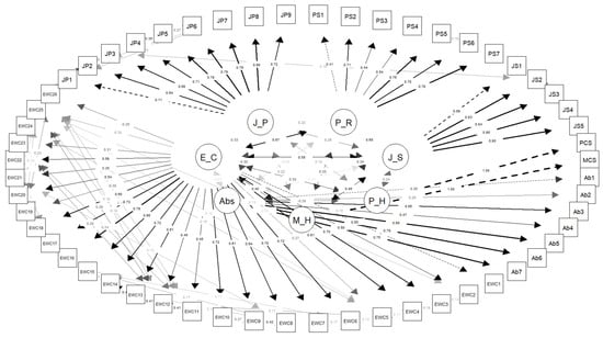 The path diagram constructed to evaluate the structural equation model displays the latent variables and the factor loadings of their corresponding observed variables. In the diagram, latent variables, including psychological risks, job satisfaction, physical health, mental health, absenteeism, ergonomic conditions, and JP, are included, and these are modeled on the basis of their respective items. The fact that the vast majority of the factor loadings exceeded 0.40 indicates that the items are strongly associated with their corresponding factors. Additionally, modification indices are marked for paths that exceed a certain threshold (e.g., >6 with a positive Expected Parameter Change value), thereby identifying potential areas for improvement in the model. Precautions were taken to ensure that these modification areas occurred only among the observed variables that constituted the latent variable (Figure 2).