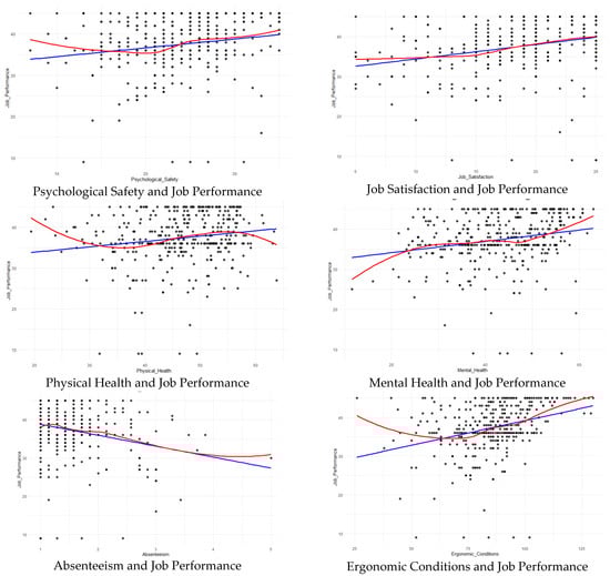 Scatter plots were analyzed, and nonlinear relationships were identified. Accordingly, the Ramsey RESET test was applied to examine the linearity, and the relationships between the dependent variable (job performance) and each independent variable were analyzed with scatter plots, providing additional context. The RESET test indicated that the functional form was linear for job satisfaction (p = 0.4729) but nonlinear for physical health (p = 0.00609), mental health (p = 0.03592), and ergonomic conditions (p = 0.0005796). For psychological safety and absenteeism, the p-values (0.09599 and 0.1123, respectively) suggested linearity at a 95% confidence level. However, as deviations from linearity, captured by the Loess curve, were visually observed for most variables except for job satisfaction, further investigation of these nonlinear associations was performed using polynomial regression models. In the scatter plots, the blue line represents the fitted linear regression line, while the red line shows the nonlinear trend.