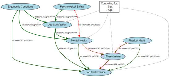 A strong positive correlation was noted between psychological safety and job satisfaction (r = 0.539; p < 0.001), indicating that a supportive and communicative work environment significantly enhances employees’ satisfaction. The strongest correlation in the matrix was between psychological safety and job satisfaction, underscoring the central role of psychological security in shaping job-related attitudes. In contrast, the weakest correlations were observed between psychological safety and absenteeism (r = −0.156; p = 0.002) and between job satisfaction and absenteeism (r = −0.131; p = 0.010), suggesting that these factors may influence absenteeism only indirectly or in interaction with other variables. Psychological safety also showed a moderate positive correlation with ergonomic conditions (r = 0.497; p < 0.001) and a weak positive correlation with job performance (r = 0.221; p < 0.001). Job satisfaction demonstrated weak-to-moderate positive correlations with physical health (r = 0.238; p < 0.001), mental health (r = 0.430; p < 0.001), ergonomic conditions (r = 0.473; p < 0.001), and job performance (r = 0.340; p < 0.001). Physical health showed only weak associations with most variables, including mental health (r = 0.160; p = 0.002) and job performance (r = 0.190; p < 0.001), and a negative correlation with absenteeism (r = −0.222; p < 0.001). Similarly, mental health was moderately correlated with ergonomic conditions (r = 0.334; p < 0.001), positively with job performance (r = 0.258; p < 0.001), and negatively with absenteeism (r = −0.227; p < 0.001). Absenteeism demonstrated consistently weak negative correlations with all other variables, including ergonomic conditions (r = −0.104; p = 0.041) and job performance (r = −0.196; p < 0.001). Finally, ergonomic conditions showed a moderate positive correlation with job performance (r = 0.364; p < 0.001), highlighting the role of a well-organized physical environment in boosting employee effectiveness (Figure 3).