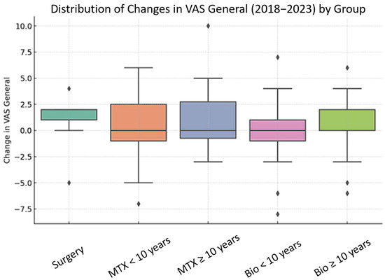 Distribution of changes in general pain (VAS General) between 2018 and 2023 by group. The analyzed groups include patients treated with surgery, methotrexate (MTX) for <10 years and ≥10 years, and biological therapy (Bio) for <10 years and ≥10 years. Each box represents the interquartile range (25–75%), with the central line indicating the median. The whiskers show values within 1.5 times the interquartile range, while the dots represent outliers. Although ANOVA and Kruskal–Wallis tests suggested global differences (p = 0.0089 and p = 0.0138, respectively), post hoc pairwise comparisons using Bonferroni-corrected Mann–Whitney U tests did not reveal any statistically significant differences between specific subgroups. A summary of pairwise comparisons is provided in Supplementary Table S1.