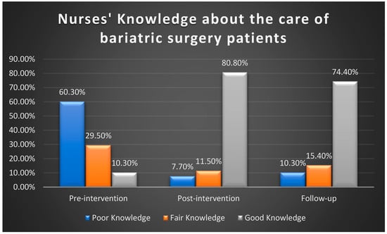 Overall, these findings demonstrate that the implementation of the reference guide substantially enhanced nurses’ knowledge of pre- and postoperative care for bariatric surgery patients, although a decline in knowledge retention was observed at the follow-up stage.