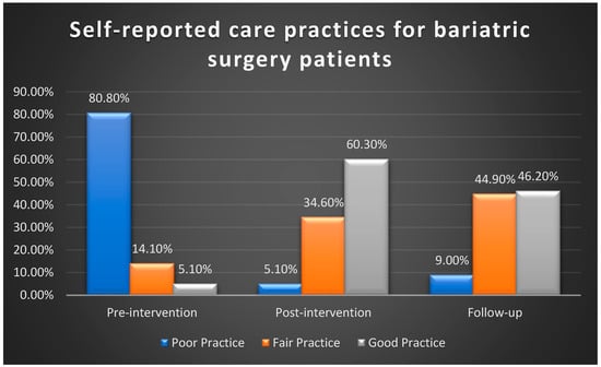 Overall, the findings demonstrated that implementing the reference guide significantly enhanced nurses’ self-reported practices in the pre- and postoperative care of bariatric surgery patients. However, a decline was noted in the practice scores at the follow-up stage.