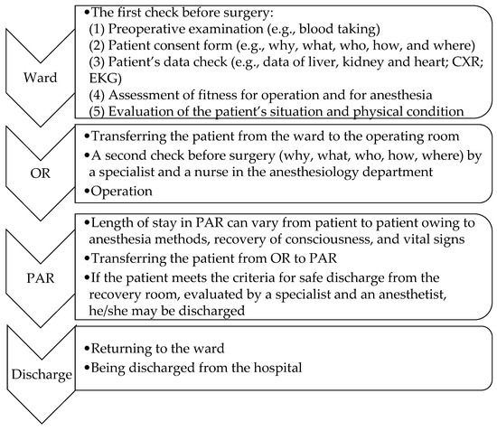 The operating time includes the induction time, the treatment time, and the cleaning time before the patient’s leaving the operating room. Figure 1 shows the steps of the ORMS procedure. Step one is when the patient enters the ward. The tasks undertaken in the ward include the following: (1) preoperative examination, (2) patient consent form, (3) patient’s data check, (4) assessment of fitness for operation and anesthesia, and (5) evaluation of the patient’s situation and physical condition by specialists. Step two is when the patient enters the operating room (OR). The simulation design includes different configurations tailored to specific surgical specialties. The tasks undertaken in this step are a second check by a specialist and a nurse in the anesthesiology department and the operation. Step three is when the patient enters post-anesthesia recovery (PAR), and the tasks in this step are monitoring vital signs and the recovery of consciousness. Finally, the patient is returned to the ward or discharged from the hospital.