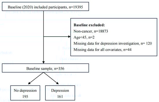 The sample for this survey was drawn from the fifth round of national surveys conducted in 2020 by the China Health and Retirement Longitudinal Study (CHARLS), a tracking survey representative of the mainland Chinese population aged 45 years and older. The overarching aim of CHARLS is to build a high-quality public micro-database collecting multidimensional information covering socioeconomic status and health status to meet the needs of scientific research on aging. To ensure the representativeness of the sample, the CHARLS baseline survey used multi-stage (county/district–village/residence–household) PPS random sampling based on implicit stratification (the stratification indicators are region, urban/rural attributes, and GDP per capita), which covered 150 countries/regions and 450 villages/urban communities nationwide, involving 17,705 people in 10,257 households, thereby reflecting the overall situation of the middle-aged and older population in China [19]. Furthermore, CHARLS is a tracking survey; as the study continues, the age of the respondents will increase if new samples are not added, which will result in the younger cohorts no longer being represented. Accordingly, the aggregate number of respondents (primary respondents in addition to their spouses) increased from 17,708 in the baseline survey to 19,395 in Wave 5. The criteria for selecting respondents for this study were as follows: Firstly, respondents were required to be above the age of 45. Secondly, respondents were required to have data from the Center for Epidemiologic Studies Depression Scale (CES-D) provided by CHARLS. Thirdly, respondents must have selected “Yes” in the “Cancer” column. Finally, independent variables were selected based on valid responses to questions regarding gender, age, place of residence, and marital status. A detailed flowchart of the sample selection process is shown in Figure 1.