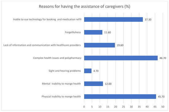 Patient-reported reasons for the need for caregiver assistance are illustrated in Figure 1. The most common were having complex health issues and polypharmacy (46.7%), followed by the presence of physical inability to manage health (45.7%), the inability to use technology for booking appointments, and refilling medications (37.3%).
