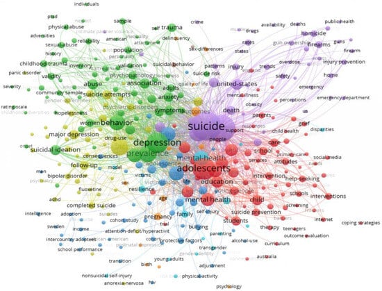 In the case of WoS (Figure 1), 8 clusters of 327 items were identified. The total weight of the 10,443 interconnections was 22,626. About the study objective, Cluster 5 (purple) interconnected “Suicide” (314 links, 2415 total strength, 367 occurrences) and “Child*” (297 links, 2101 total strength, 318 occurrences), with these being the two KW with the highest total weight compared to the other KW. “Educat*” was in Cluster 1 (red) (148 links, 372 strength, 60 occurrences) with a lower total weight. However, 92.3% of their relationships were with Cluster 5.