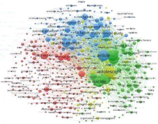 In the case of Scopus (Figure 2), due to the high number of KW, the results were reduced to the first 500 KW with the highest reach force. Four clusters consisting of 497 items were identified. The total weight of the 579,763 interconnections was 87,145. Concerning the study objective, Cluster 2 (green) interconnected “Suicide” (496 links, 27,423 total strength, 1364 occurrences), “Child*” (496 links, 27,032 total strength, 1278 occurrences), and “Educat*” (496 links, 10,961 strength, 540 occurrences), with these being the first three KW with the highest total weight compared to the other KW, even though "Adolescent" found in Cluster 4 had a higher total weight.