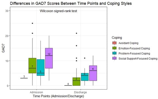 Figure 2 illustrates the differences in the GAD7 scores at admission and discharge across the four coping styles, analyzed using the Wilcoxon signed-rank test. The boxplots show the distribution of the anxiety levels at the two points for each coping style, highlighting variations in the degree of improvement. Participants using social-support-focused coping (n = 21) showed the highest anxiety levels at admission, with a median GAD7 score of 12. By discharge, the median had decreased to 6, reflecting a 50% reduction in anxiety. This coping style, however, remained associated with the highest residual anxiety levels compared to the other strategies. For emotion-focused coping, the largest group in the cohort (n = 44), the median GAD7 score decreased from 7 to 2, indicating a significant reduction in anxiety symptoms over time. Participants using problem-focused coping (n = 31) experienced a decrease from a median score of 5 at admission to 4 at discharge, reflecting a smaller improvement. In the avoidant coping group, the smallest subgroup (n = 4), the median GAD7 score decreased from 3 at admission to 0 at discharge, suggesting a complete resolution of anxiety symptoms in this group. While all the coping styles were associated with reductions in the anxiety levels, social-support-focused coping showed the largest absolute reduction in the median GAD7 scores, with higher residual anxiety.