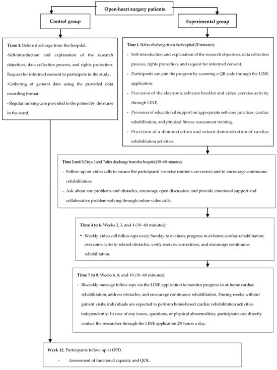 An HBCR program was developed by researchers for open-heart surgery patients using the LINE application. This program was based on Orem’s Theory of Self-Care [25], the CR guidelines from the Heart Association of Thailand under the Royal Patronage of H.M. the King [35], and relevant literature reviews. The HBCR program was validated by five experts, who determined that the Content Validity Index was 1.0. The program’s duration was 12 weeks and included 10 contacts with the participants. The data for the intervention group were collected as shown in Figure 1. The program implementation comprised several key elements: (1) the researcher developed a 24-page electronic self-care handbook and a 15–20 min video about the HBCR program. The electronic handbook included information such as the disease, risk factors, smoking cessation, healthy eating, daily activities, dietary guidelines, stress management, medication adherence, wound care, self-monitoring of vital signs, cardiac rehabilitation, and the benefits of cardiac rehabilitation. The video about the HBCR program included warm-up exercises, walking routines, and cool-down exercises. The video also covered abnormal signs that indicate the need to stop exercising, along with corrective measures. The HBCR program involved 30 min sessions at least 3 days a week throughout the 12-week program. (2) The researcher assessed participants’ self-care and CR knowledge before hospital discharge. The participants then joined the program through the LINE application using an official account and accessed the video and electronic self-care handbook. The researcher explained the contents, demonstrated the CR activities, and then had the participants perform a return demonstration to ensure that they understood and could perform them correctly. (3) The researcher facilitated the exchange of learning and practical skills following hospital discharge. On days 3 and 7 postdischarge, the researcher provided video call follow-ups to monitor the correctness of exercise routines and encouraged continuous physical activity. (4) In weeks 2, 3, and 4 postdischarge, the researcher performed weekly video call follow-ups every Sunday. The researcher would review the participants’ self-care activities, asking about problems and obstacles they encountered with respect to CR and taking care of themselves, as well as encouraging discussion and creating opportunities for patients to express their concerns, providing emotional support and engaging in collaborative problem-solving during the LINE video calls. (5) In weeks 6, 8, and 10 postdischarge, biweekly LINE application visits were conducted on Sundays to assess the progress of the at-home cardiac rehabilitation. The researcher provided continuous follow-ups and support for CR through the LINE application. During the weeks in which participants did not have visits scheduled, they were expected to carry out the cardiac rehabilitation activities at home independently. If there were any issues, questions, or physical abnormalities, the participants could contact the researcher directly through the LINE application at any time of the day.