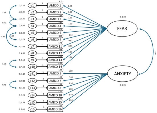 Figure 1 illustrates the factorial structure of the AMICO scale as confirmed through the CFA. The model supports a two-factor solution comprising “Fear” and “Anxiety”, each associated with their corresponding items. The standardized factor loadings indicated moderate to high relationships between items and their latent constructs, supporting the internal structure of the scale. The correlation between the two latent variables (fear and anxiety) is also shown, suggesting a strong positive association and conceptual coherence between the two dimensions.