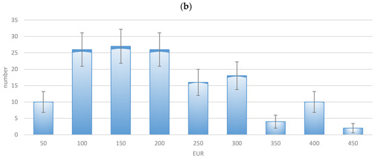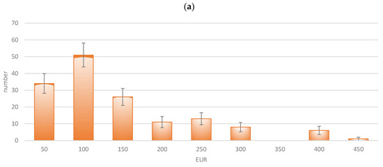 To this end, participants were asked to state the maximum monthly amount that they would spend on all healthcare services (medical care, hospital care, therapy, medication, and rehabilitation measures) at an “optimum benefit level” (F104). Such expenditure might include health insurance contributions, as well as payments for optional services and supplementary benefits. The answers were, therefore, given in EUR and were divided into classes with a width of EUR 50. The results are presented in Figure 1.