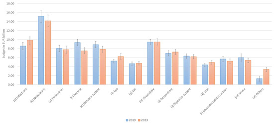The real medical costs in Germany were taken from the Federal Health Report 2024 [18]. These medical costs were then classified according to the ICD-10 categories and divided according to allocation preferences. Data on medical costs were collected infrequently; the most recent such data available were for the years 2015 and 2020 (with 2015 being four years before the start of the COVID-19 pandemic) [19]. The COVID-19 pandemic lasted from January 2020 to May 2023. The year 2020 was at the beginning of but completely within the pandemic period, meaning that any significant effects of the pandemic on costs were included in the available data. As the proportions have obviously remained similar, despite slight changes, it can be assumed that the proportions did not change significantly by the time of the respective surveys. An overall comparison of preferences and costs can, therefore, be made for the periods before, during, and after the pandemic, taking the above assumptions into account.