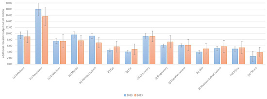 As with the overall budget, allocation preferences for research budgets have not changed significantly. The overall rankings remained similar, with only minor differences in distribution between 2019 and 2023. In 14 out of 14 categories, the 2-sigma error margins overlapped, and the remaining categories showed similar values (Figure 3). The null hypothesis that the difference in diagnosis frequencies between 2019 and 2023 exceeds ±2.5 percentage points overall was rejected using the Two One-Sided Tests (TOST) procedure (p = 0.0405), indicating that the distributions can be considered statistically equivalent. This suggests that no practically relevant differences occurred in the distribution over time (In addition, the null hypothesis that there is no difference in diagnosis frequencies between 2019 and 2023 could not be rejected based on an independent samples t-test (p = 0.9345), suggesting that the distributions remained stable over time). Accordingly, Hypothesis H1b must be rejected, as the results for research budget preferences were even more consistent across the two periods than those for total budget allocations.