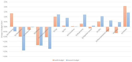 With regard to these different directions (and resulting increased differences), a further distinction can be made between cases with increased expenditure and lower expectations/preferences (i.e., cancer, mental illnesses, and nervous systems) and those with reduced expenditure and higher expectations (e.g., infections, eye care, and skin conditions).